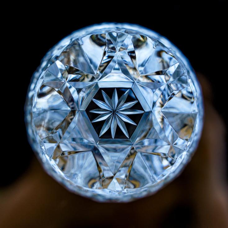 The base patterns are first incised at fixed angles to define depth and rhythm. A rotating wheel charged with abrasive slurry removes glass in controlled passes to establish the major grooves and facets. This stage determines clarity, alignment, and the crisp intersections of lines—results that rely on years of hand–eye training and an artisan’s steady control.