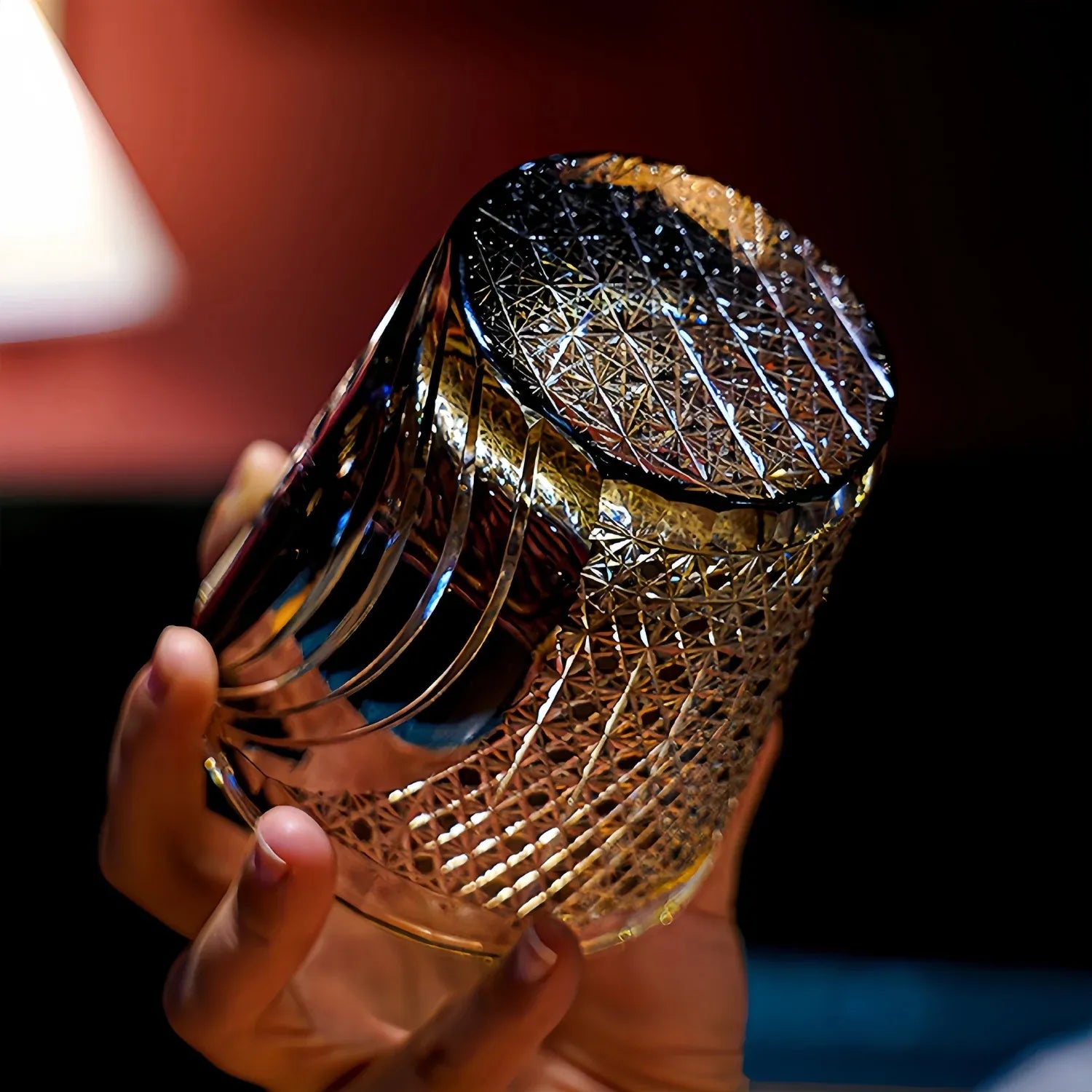 The dark glass contrasts strikingly with fluid cut patterns, creating a sense of movement and tension, while the intricate lattice designs add refinement and sparkle. This glass stands as a tribute to strength, artistry, and heritage.