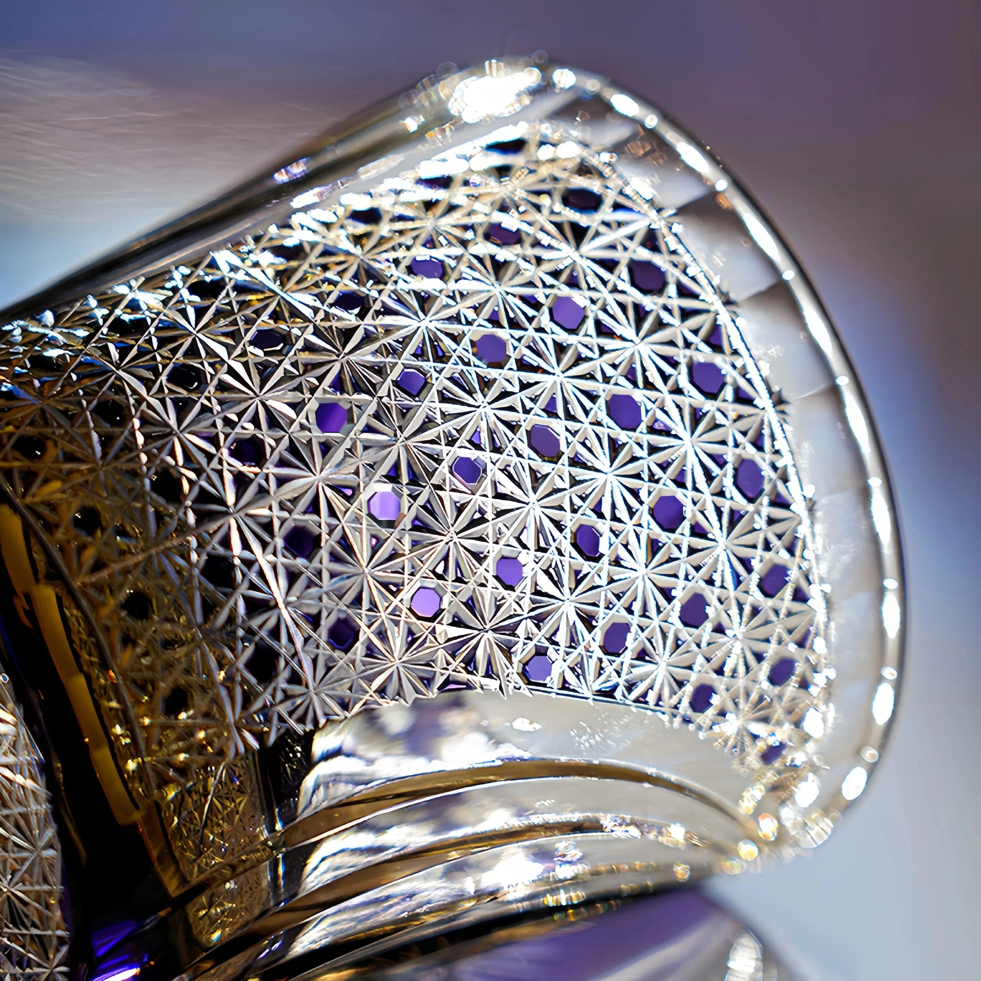 The deep purple hue blends harmoniously with bold, sweeping cuts to create a dynamic sense of movement and tension, while the delicate lattice details add shimmering depth to the surface. This whiskey glass stands as a celebration of strength, elegance, and enduring artistry.