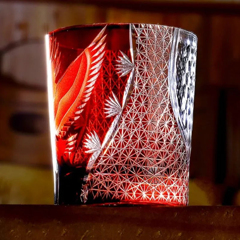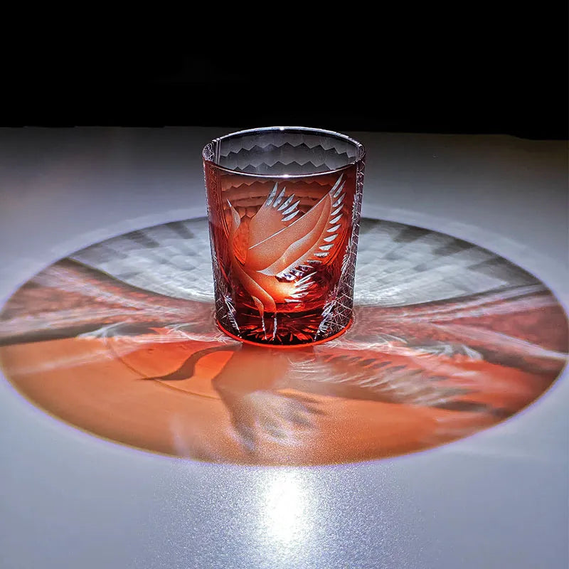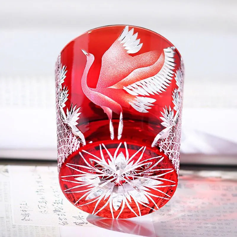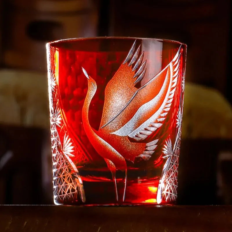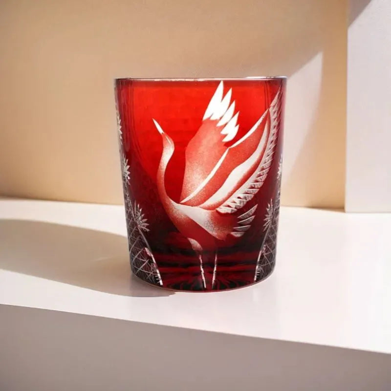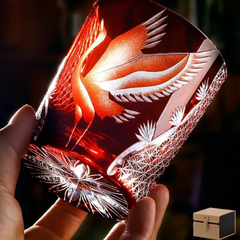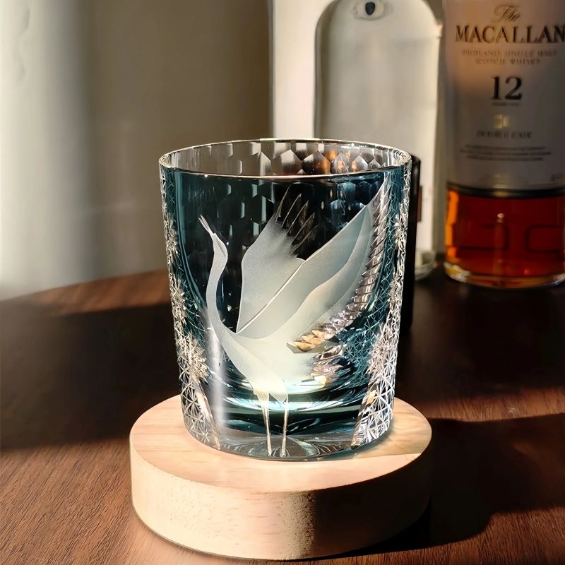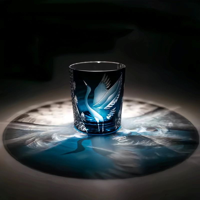 Elegant and radiant, the Flying Crane whiskey glass shines brilliantly, celebrating the eternal symbol of longevity and peace through the exquisite artistry of Edo Kiriko. A majestic crane spreads its wings in flight, meticulously carved by master artisans against a backdrop of deep twilight blue. Intricate surrounding patterns glimmer with brilliance, echoing motifs of hemp leaves and starlight—symbols of growth and prosperity.