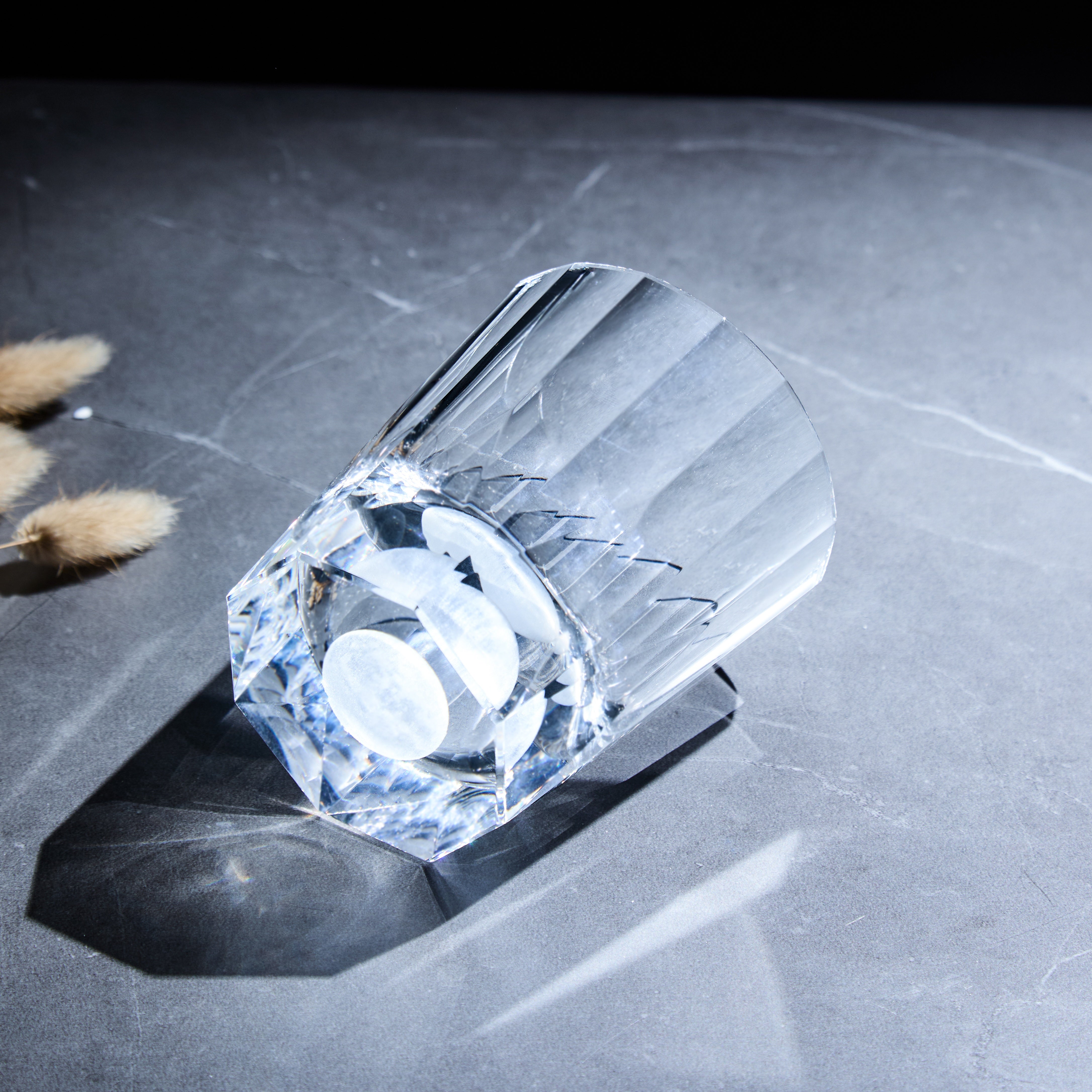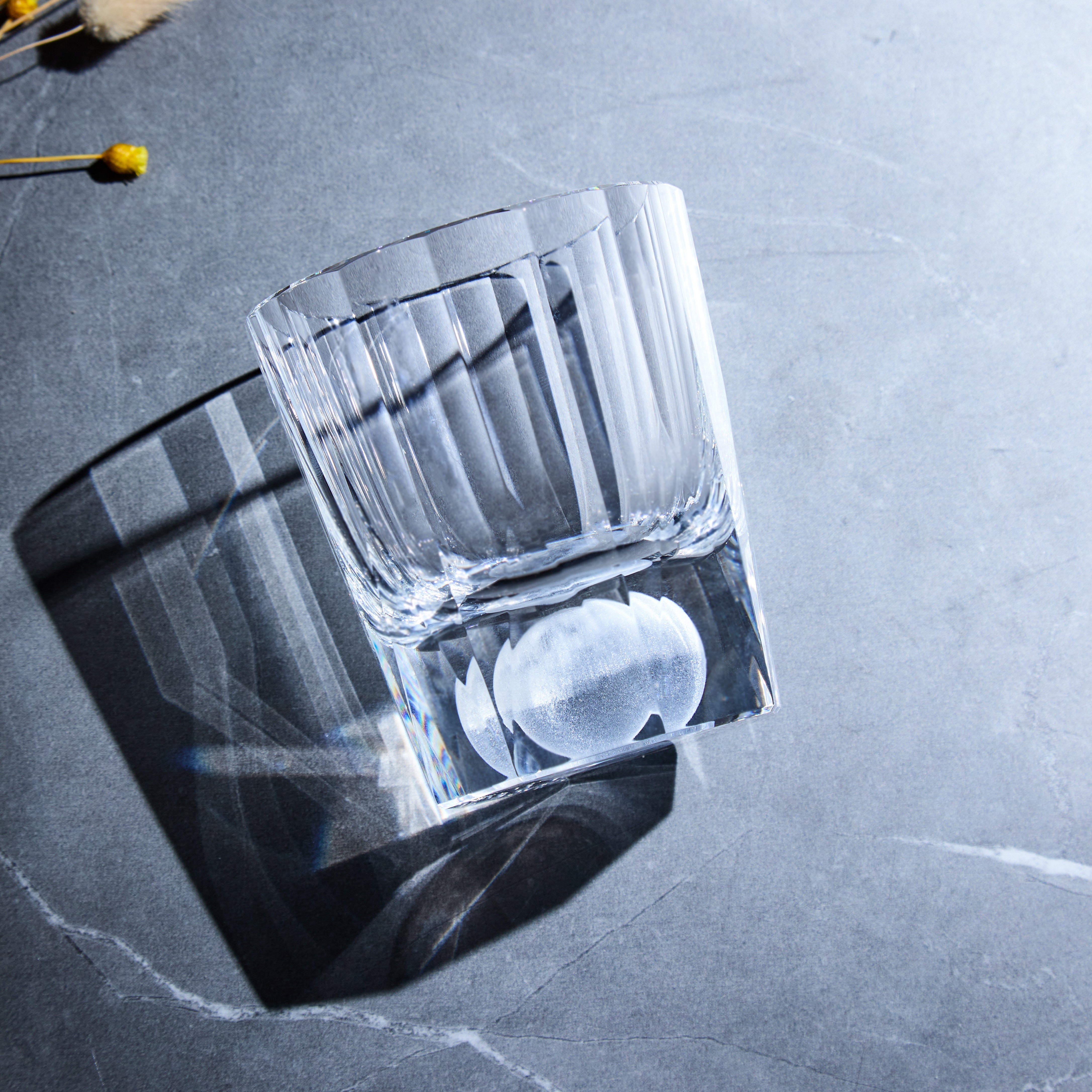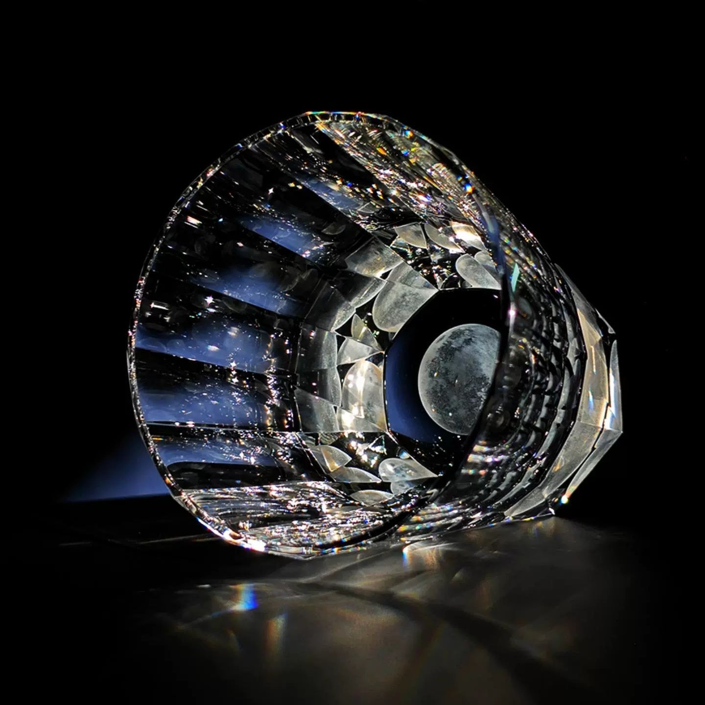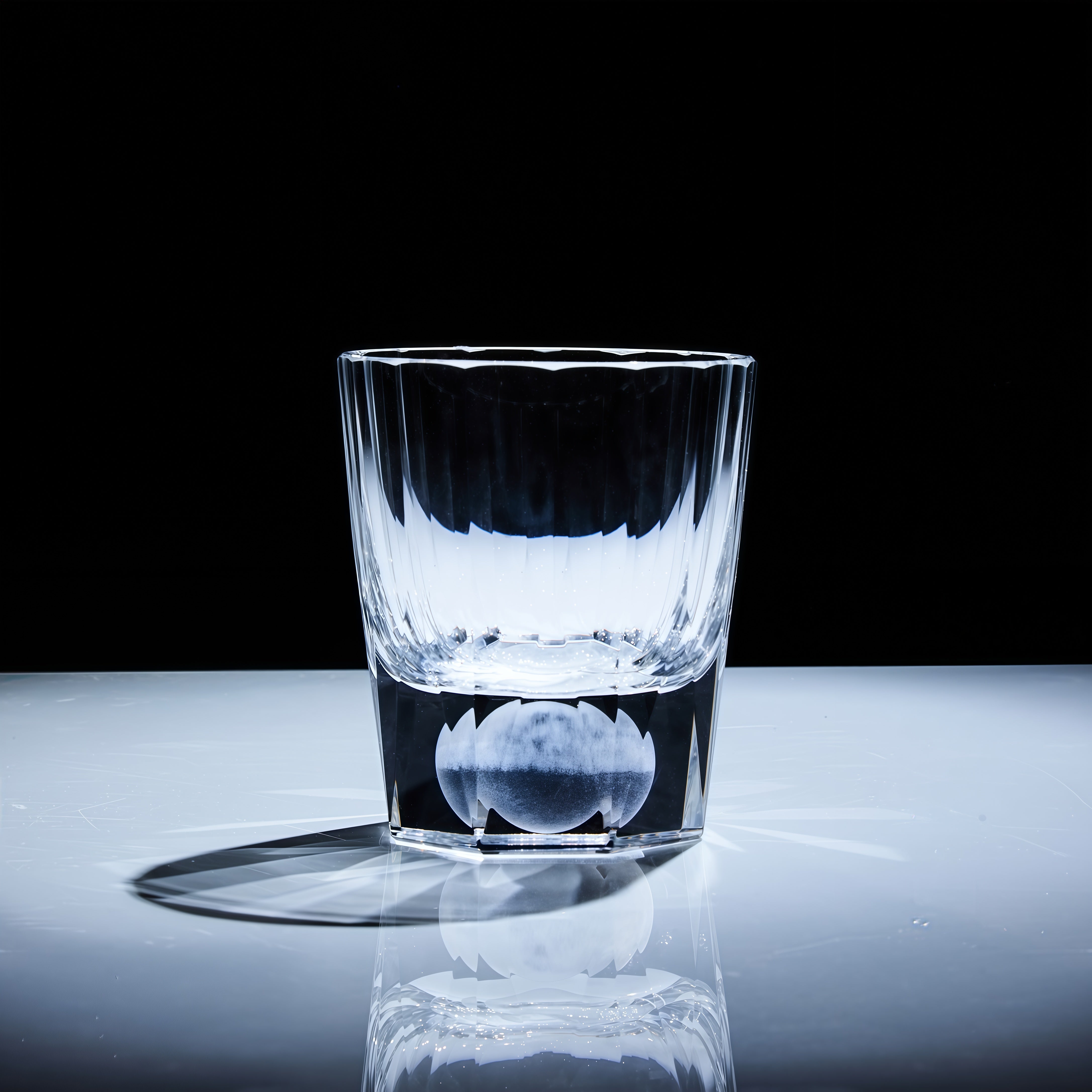 Each line of the cut glass is shaped through traditional Edo Kiriko craftsmanship, revealing a luminous depth when viewed under soft illumination. The contrast between shadow and light evokes the rhythm of the lunar cycle—calm, steady, and poetic.
