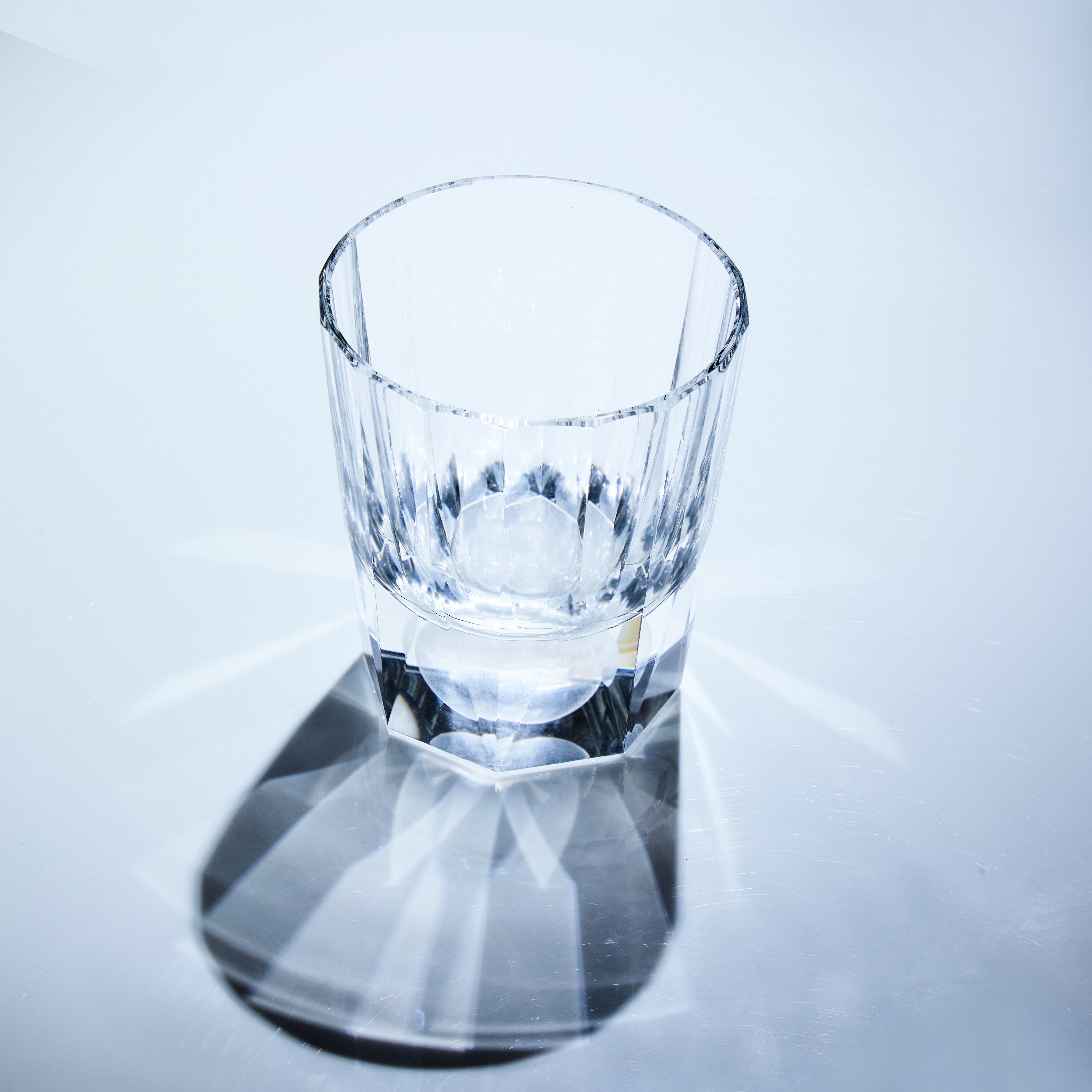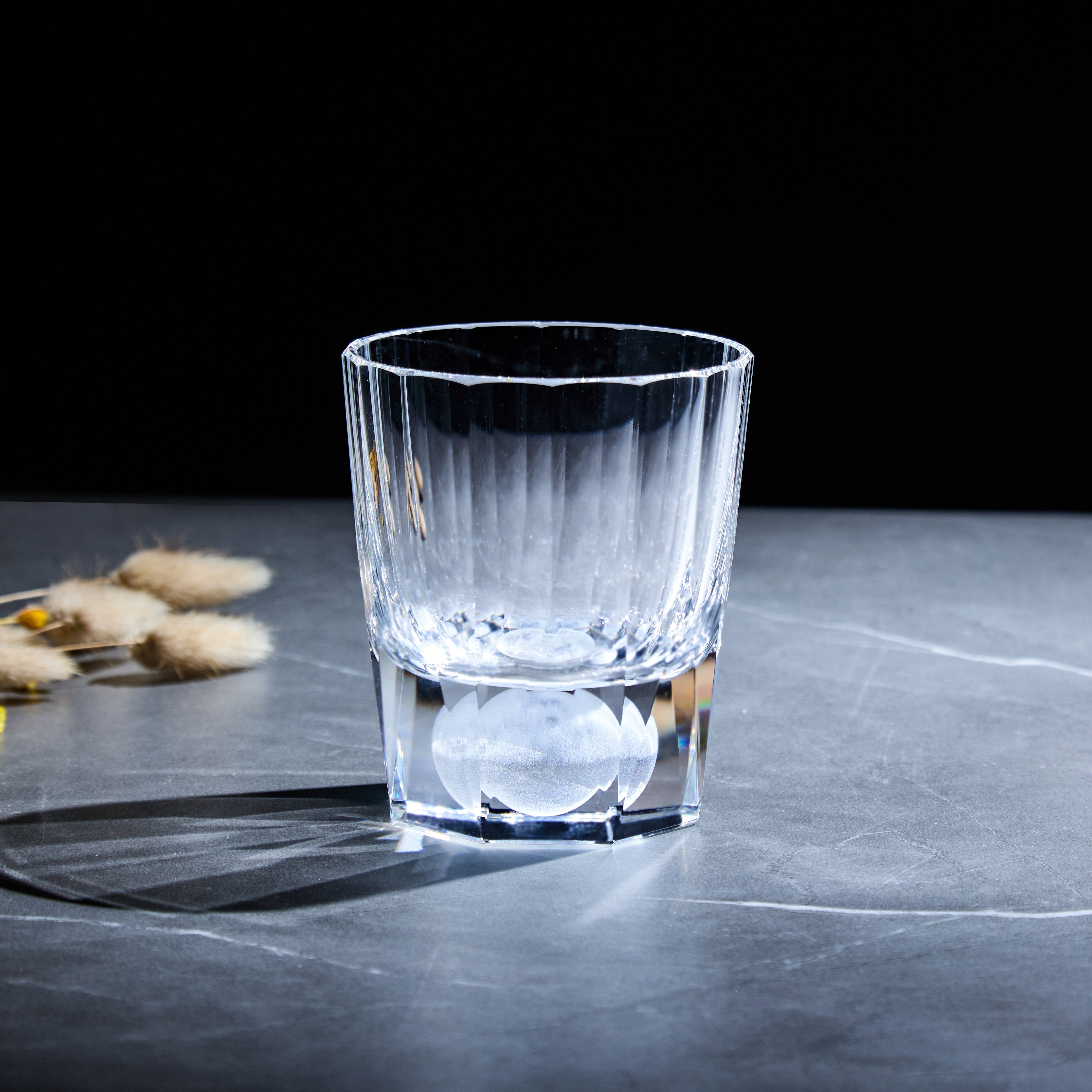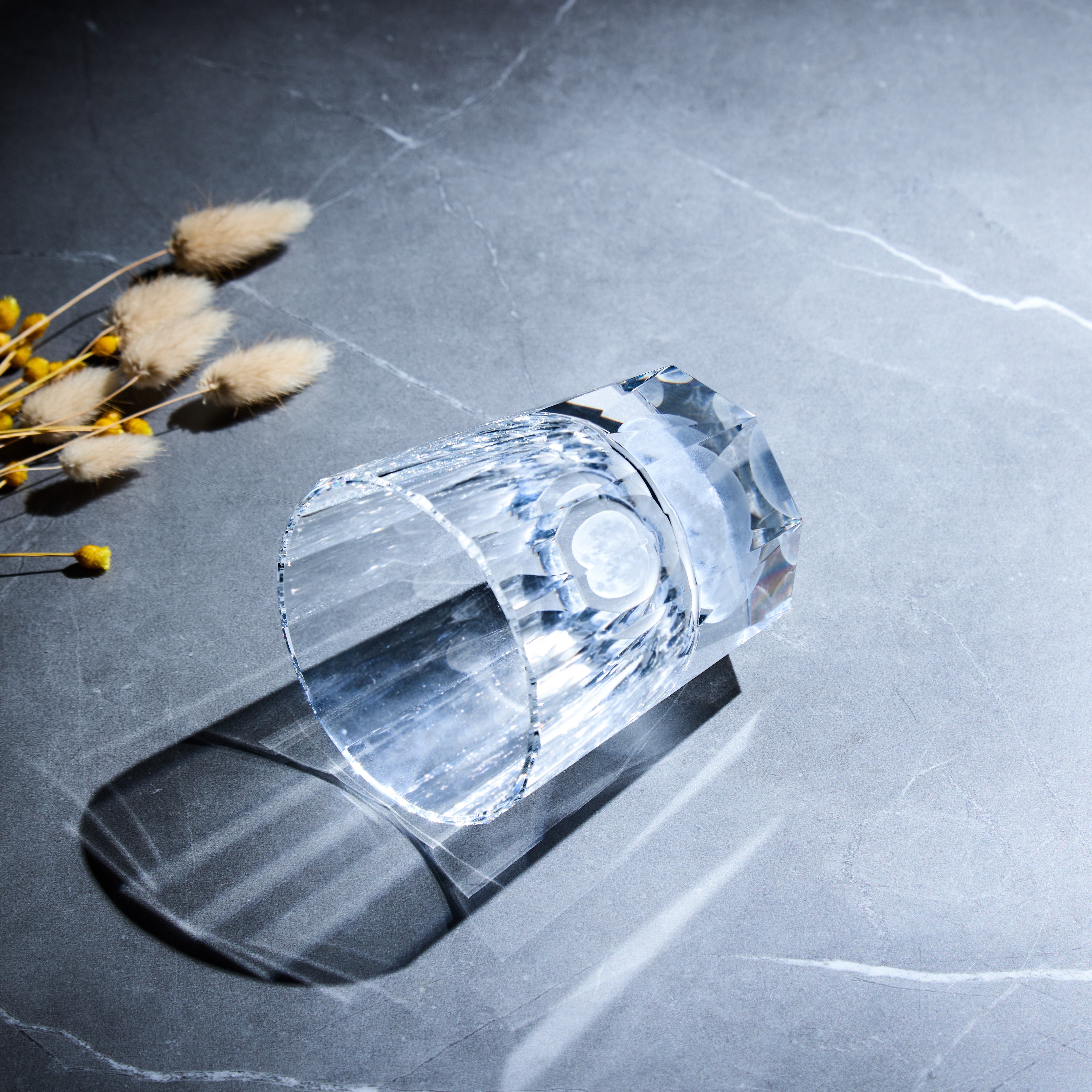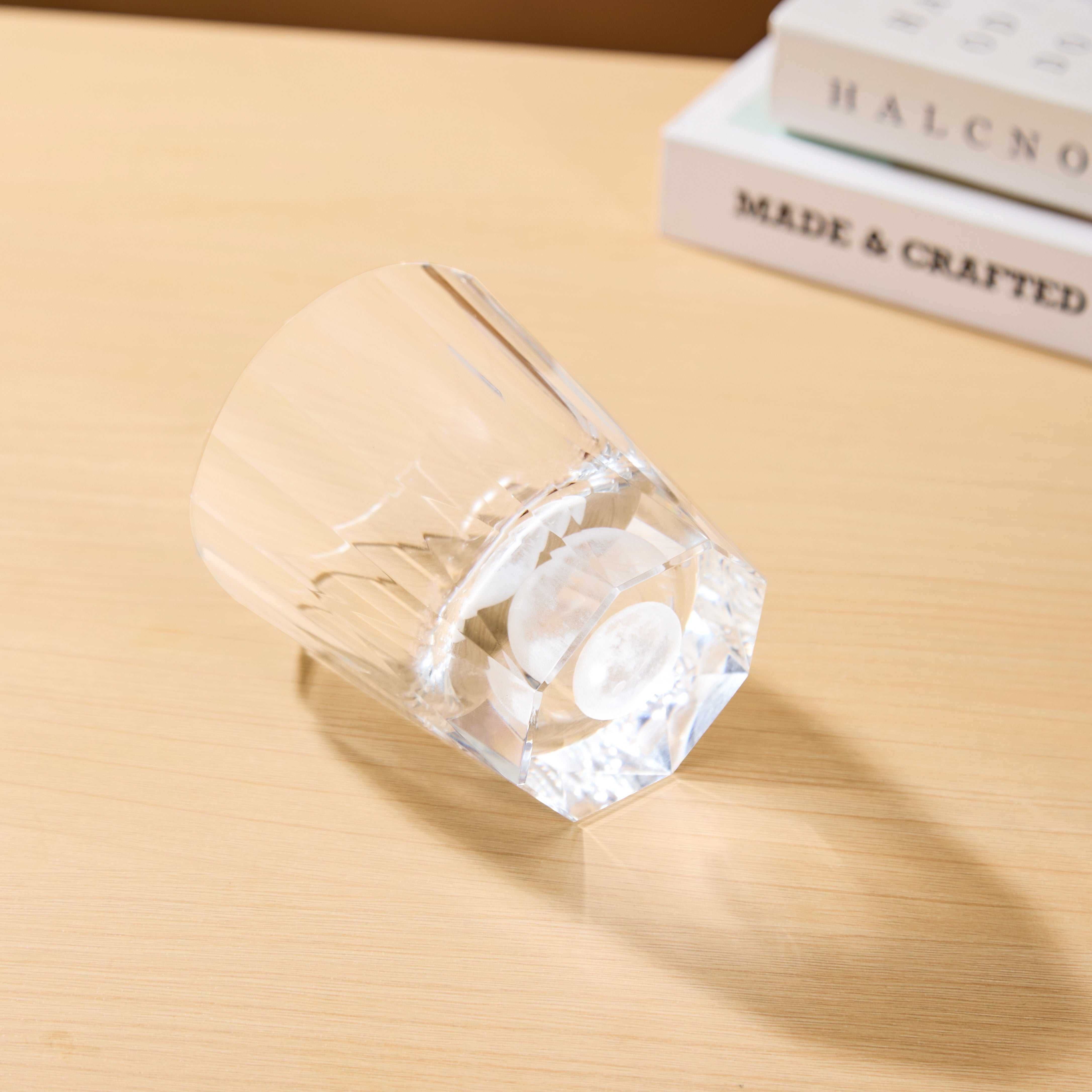 Each line of the cut glass is shaped through traditional Edo Kiriko craftsmanship, revealing a luminous depth when viewed under soft illumination. The contrast between shadow and light evokes the rhythm of the lunar cycle—calm, steady, and poetic.