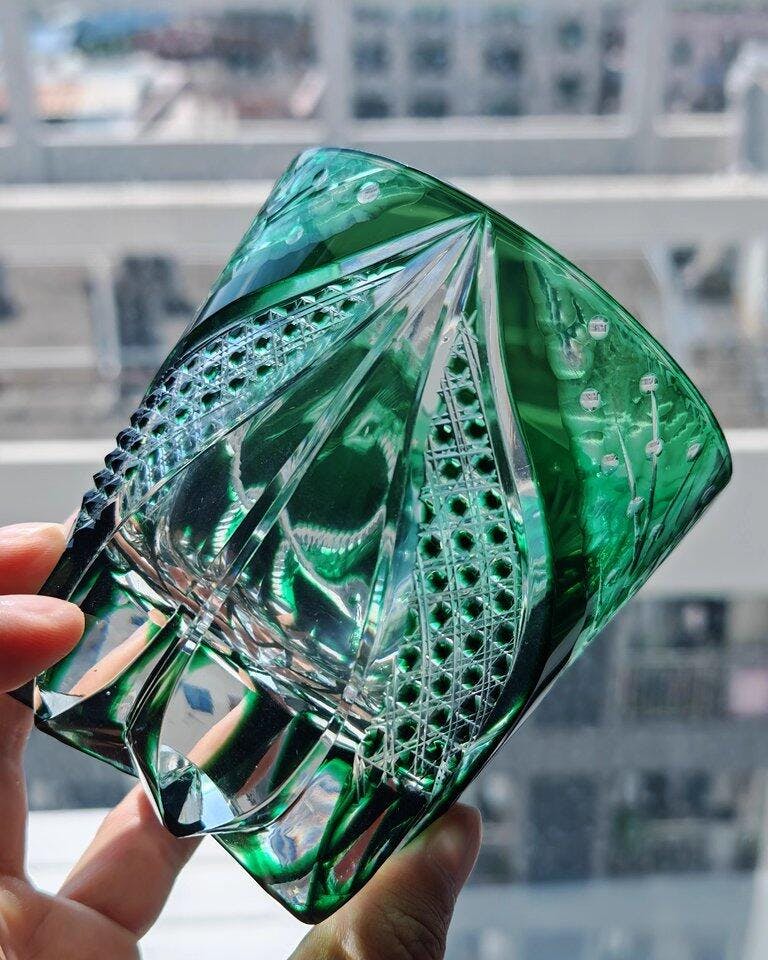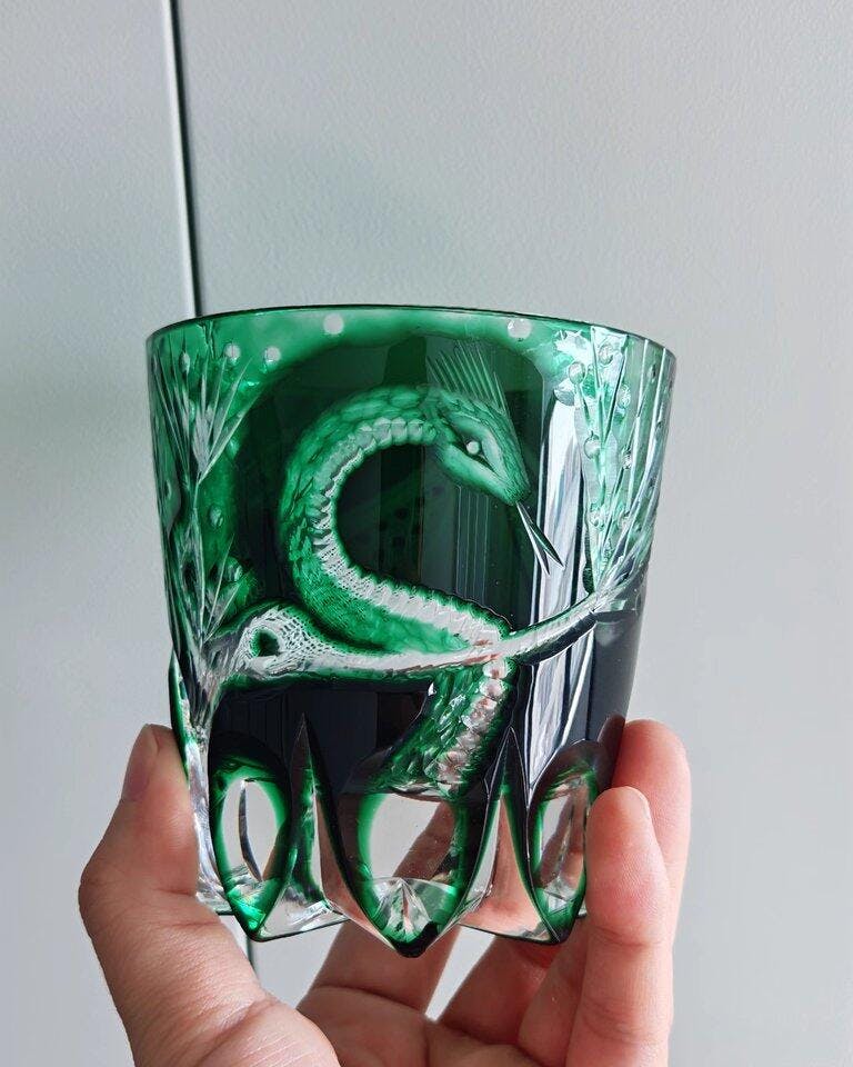 Unveil a bold symbol of transformation and strength with our Edo Kiriko Handcrafted Green Serpent Whisky Glass. This remarkable piece brings together centuries-old traditional cut glass artistry and a powerful serpentine motif, coiled elegantly around the deep emerald body of the glass.