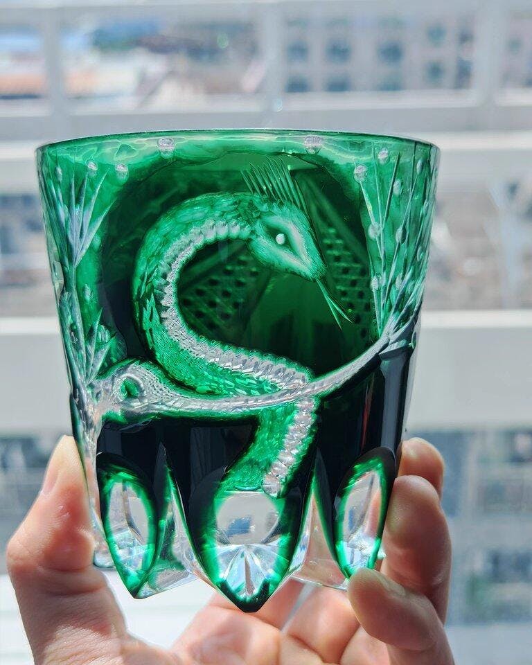 Every detail from the serpent’s scales to the delicate sakura-inspired blossoms is hand-carved by master artisans, showcasing the highest level of Edo Kiriko craftsmanship. The swirling serpent, etched with lifelike motion, appears to slither gracefully across a backdrop of layered textures and luminous green glass, creating a stunning interplay of shadow, light, and reflection.