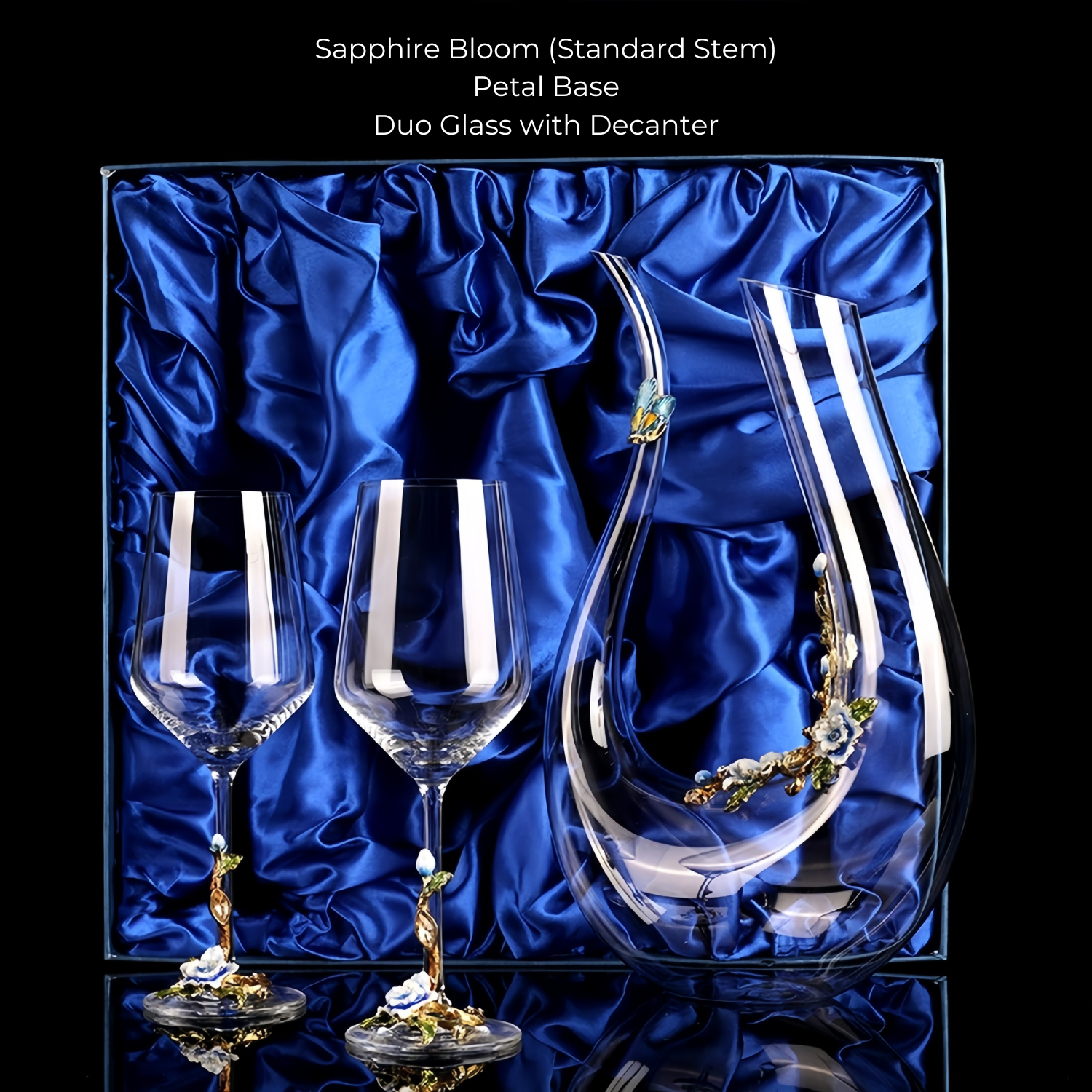 The Metallic Flower Crystal Wine Glasses with Decanter Suitcase Set is a refined celebration of elegance and artistry. Each piece in this collection is adorned with delicately sculpted enamel flowers and hand-painted golden vines, brought to life with intricate leaves and buds.