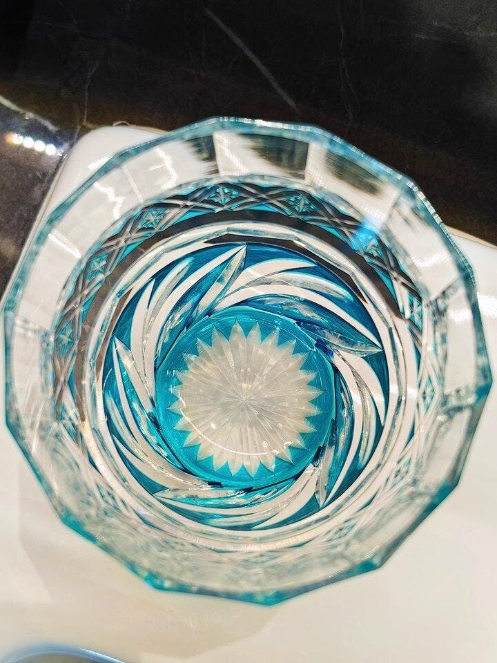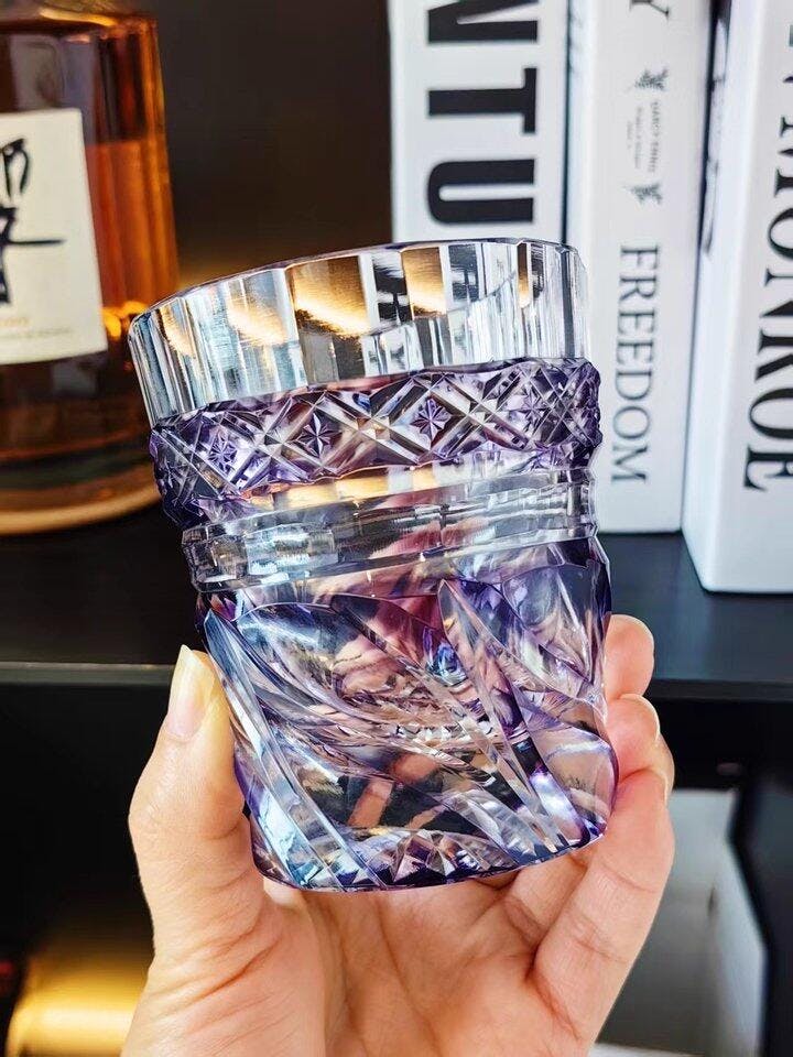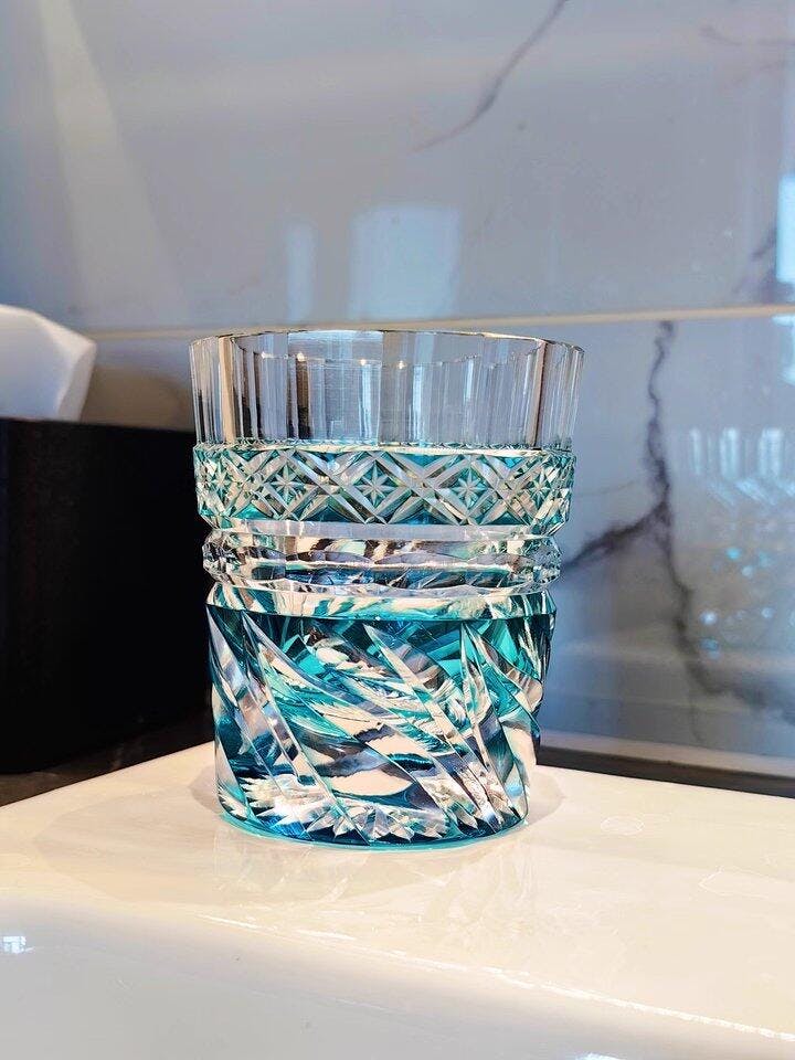 The Edo Kiriko Handcrafted Aozora Kaze Whisky Glass is an embodiment of timeless traditional artistry, capturing the clear blue skies and gentle breeze of a peaceful landscape. With its brilliant azure hue, reminiscent of "Aozora" (blue sky), this glass features intricately carved patterns that symbolize the harmony between nature and craftsmanship. The top showcases a meticulously cut diamond lattice pattern, symbolizing clarity and balance, while sweeping, wind-like curves dance across the lower part of the glass, reflecting the fluidity and grace of wind ("Kaze") as it sweeps through serene valleys.