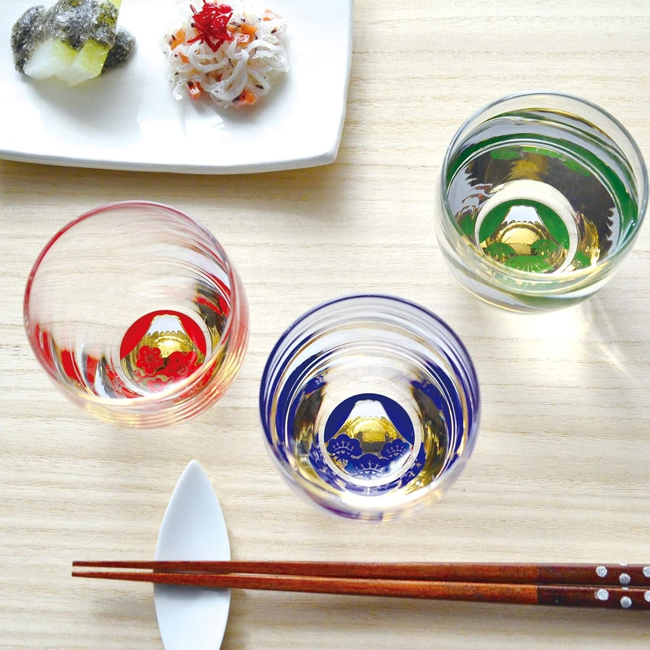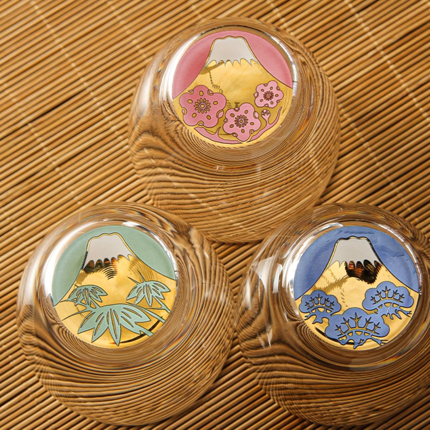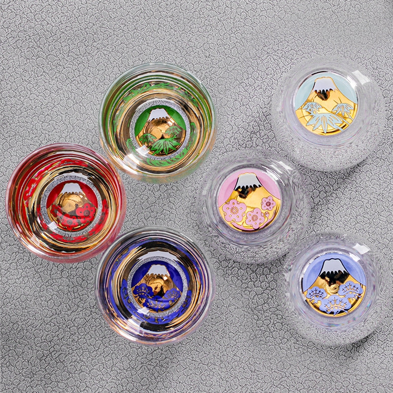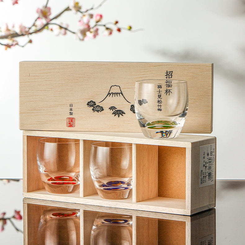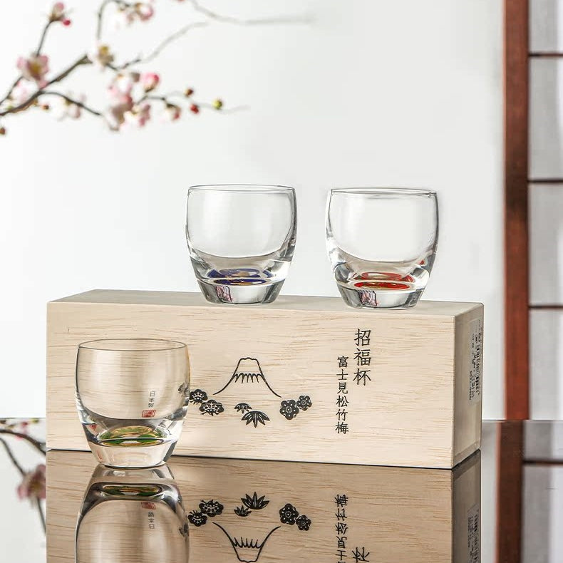 Experience the elegance of the Shochikubai Sake Glass Set from Toyo-Sasaki Glass, inspired by the auspicious motifs of pine, bamboo, and plum—symbols of perseverance, resilience, and renewal. At the base of each cup lies a hand-inlaid golden Mt. Fuji, surrounded by a vivid seasonal illustration.