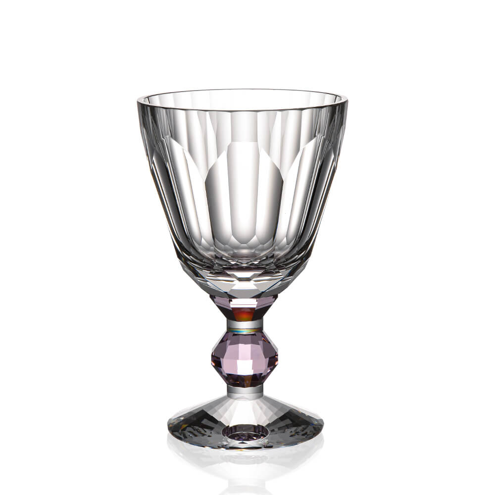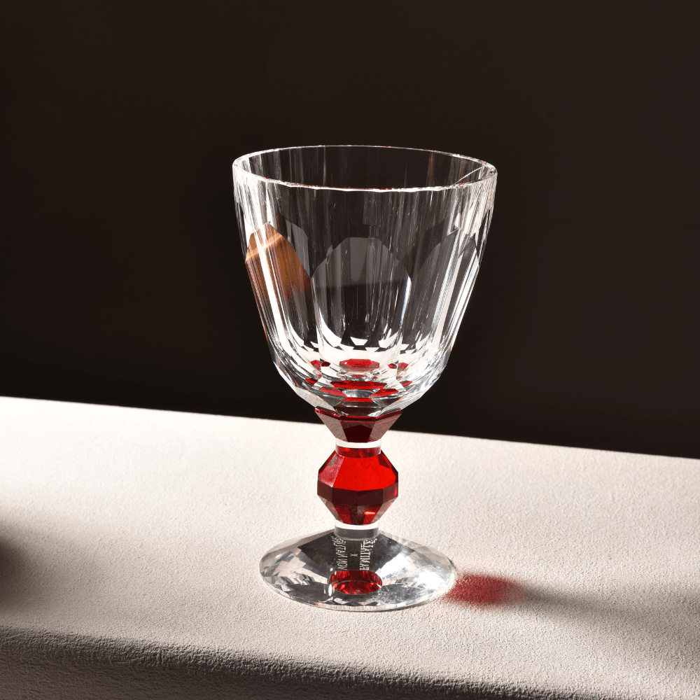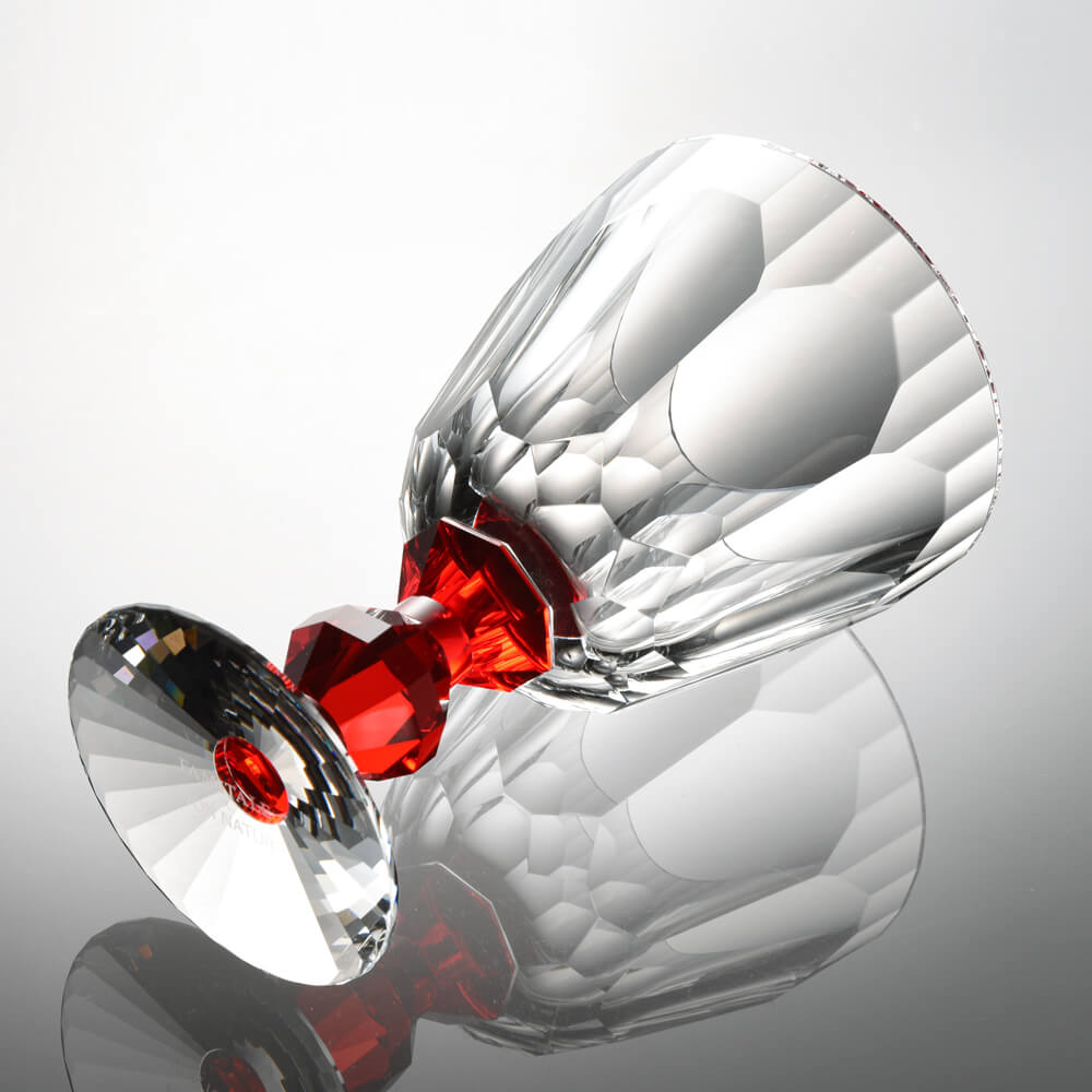 A masterpiece of French craftsmanship — this Baccarat hand cut crystal wine glass features a signature faceted bowl and a captivating jewel-toned crystal stem. Each crystal goblet is individually crafted by master artisans in Lorraine, France, making it an extraordinary addition to your luxury barware glasses collection or an unforgettable gift for any special occasion.