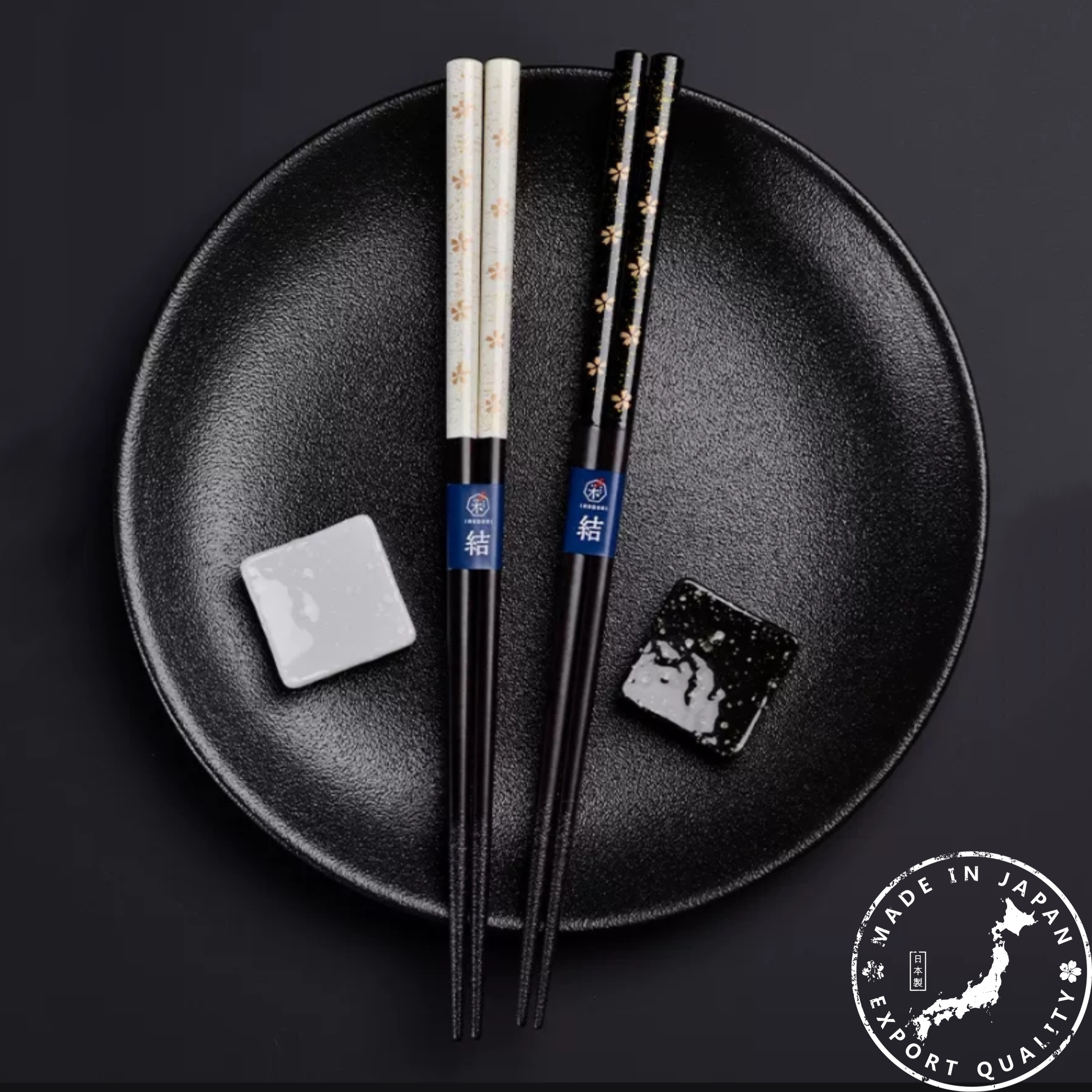 Each chopstick is adorned with golden sakura detailing, a symbol of beauty and renewal in Japanese culture, adding a refined and luxurious touch. The set also comes with matching black and white square rests to complete the presentation.
