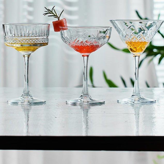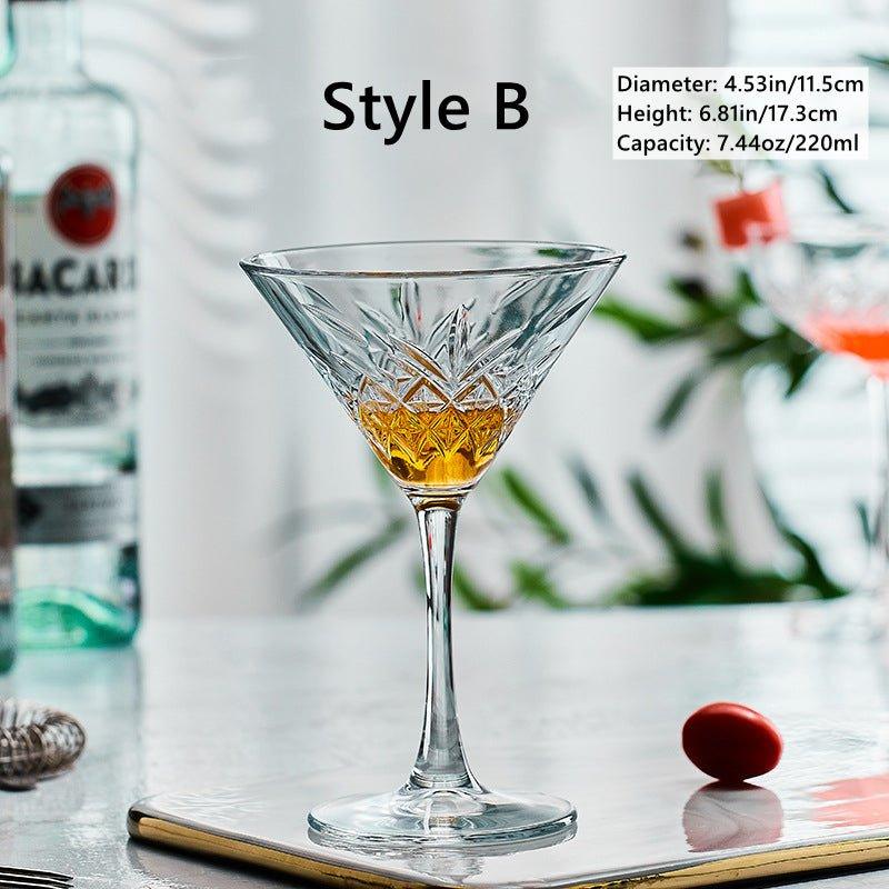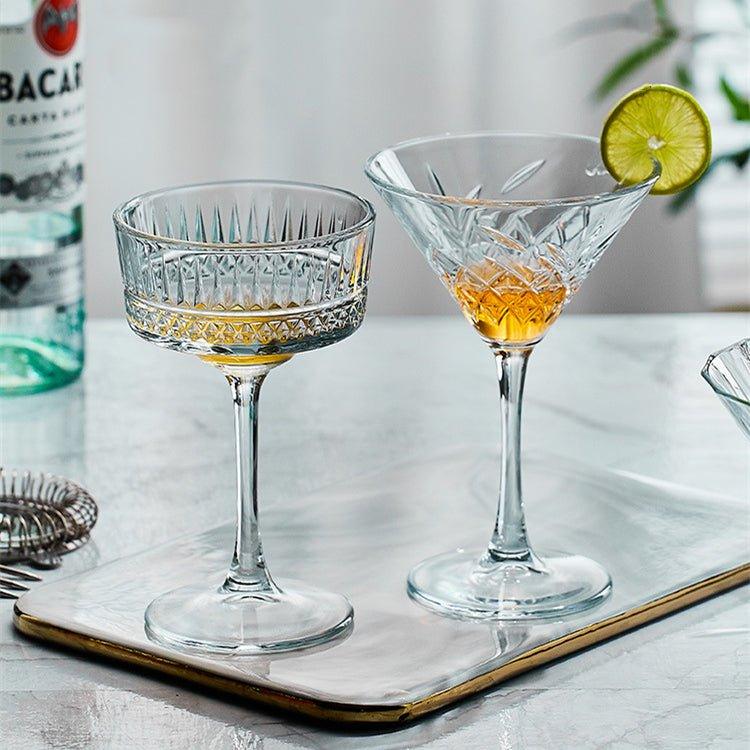 A patterned martini cocktail glass is a specialized glassware designed for serving mixed cocktails, particularly martinis. It features a unique pattern and design etched onto the glass's surface, ranging from simple geometric shapes to intricate and elaborate designs. The patterned glass is intended to enhance the drink's visual appeal and add a touch of sophistication to the overall drinking experience.
